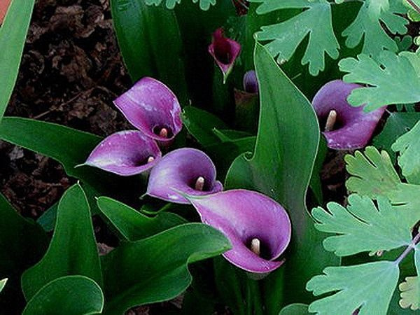 Калла - многолетнее травянистое растение с клубневидным корневищем. Листья крупные, стреловидной формы, блестящие, восковые. Соцветие одиночное на длинном цветоносе в виде кремово-желтого початка в обрамлении воронковидного, слегка волнистого покрывала. Окраска разнообразная: белая, желтая, розовая, карминная, лиловая. Аметист - высота растения 60-70 см. Цвет темно-фиолетовый, насыщенный.