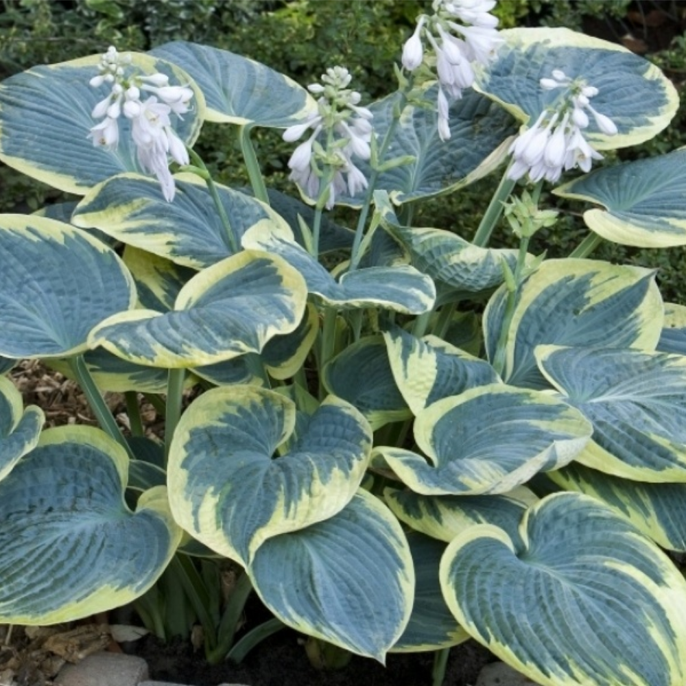 Хоста гибридная Шуга Дэдди - высота куста 50 см, ширина 70 см, листья огромные, чашевидные, гофрированные, голубые с широкой кремовой каймой. Эффектны в одиночных посадках на фоне газона. Подходит для бордюров, рабаток, смешанных групп. Красивы около водоемов. Теневыносливы, но есть гибриды, способные расти под лучами солнца. На одном месте могут расти более 20 лет.