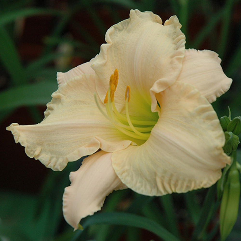 Высота - 50 см; диаметр цветка - 9 см. Нежный, светло-кремовый с легкими тонами розового. Изящная гофрировка. Продолжительное цветение. Ароматный. Полувечнозеленый, диплоид. Цветение Среднеранний (конец июля).