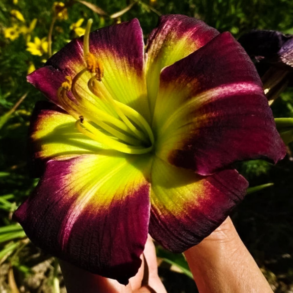 Простые округлые цветки с зеленовато-лимонным горлом состоят из трех лепестков, трех чашелистиков, шести тычинок и одного пестика. Их диаметр составляет примерно 12 см, цветки окрашены в яркий бордово-фиолетовый цвет с большим желтым центром. Бархатные на ощупь лепестки широкие и немного отогнуты назад, благодаря чему цветки получаются открытыми.
