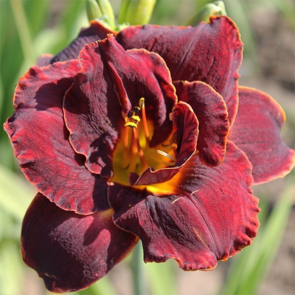 Цветонос составляет 65-75 см. Цветы крупные, до 13 см в диаметре, махровые, драматичной окраски: шоколадно-красные, с белым кантом по краю и желтым горлом. Впечатляет не только цвет, но и форма. Цветок очень красивой формы, напоминает розу, с широкими округлыми лепестками, внутренние лепестки лежат волнами. Аромат приятный.