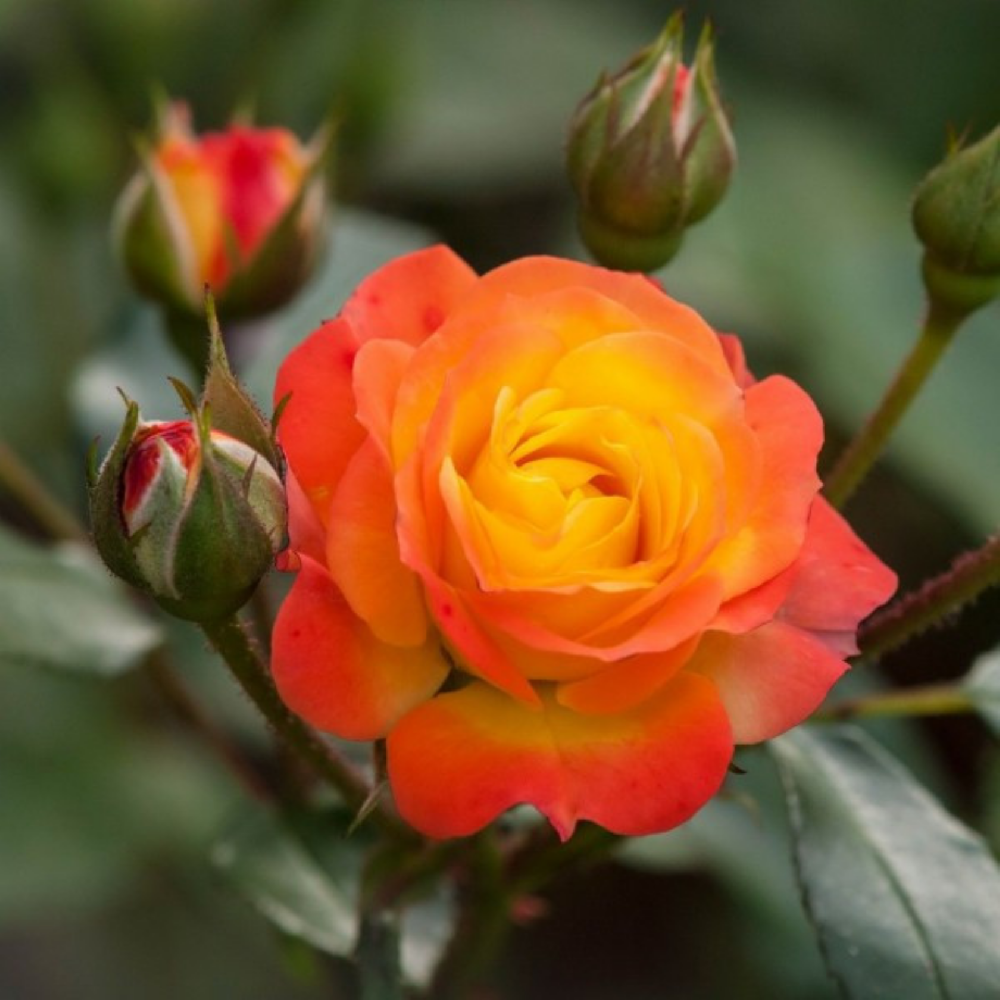 Цветки, раскрывшись, желтые, но края лепестков со временем становятся ярко-алыми, а затем малиновыми, в то время, как желтый цвет выгорает. Темно-зеленая, глянцевая листва.