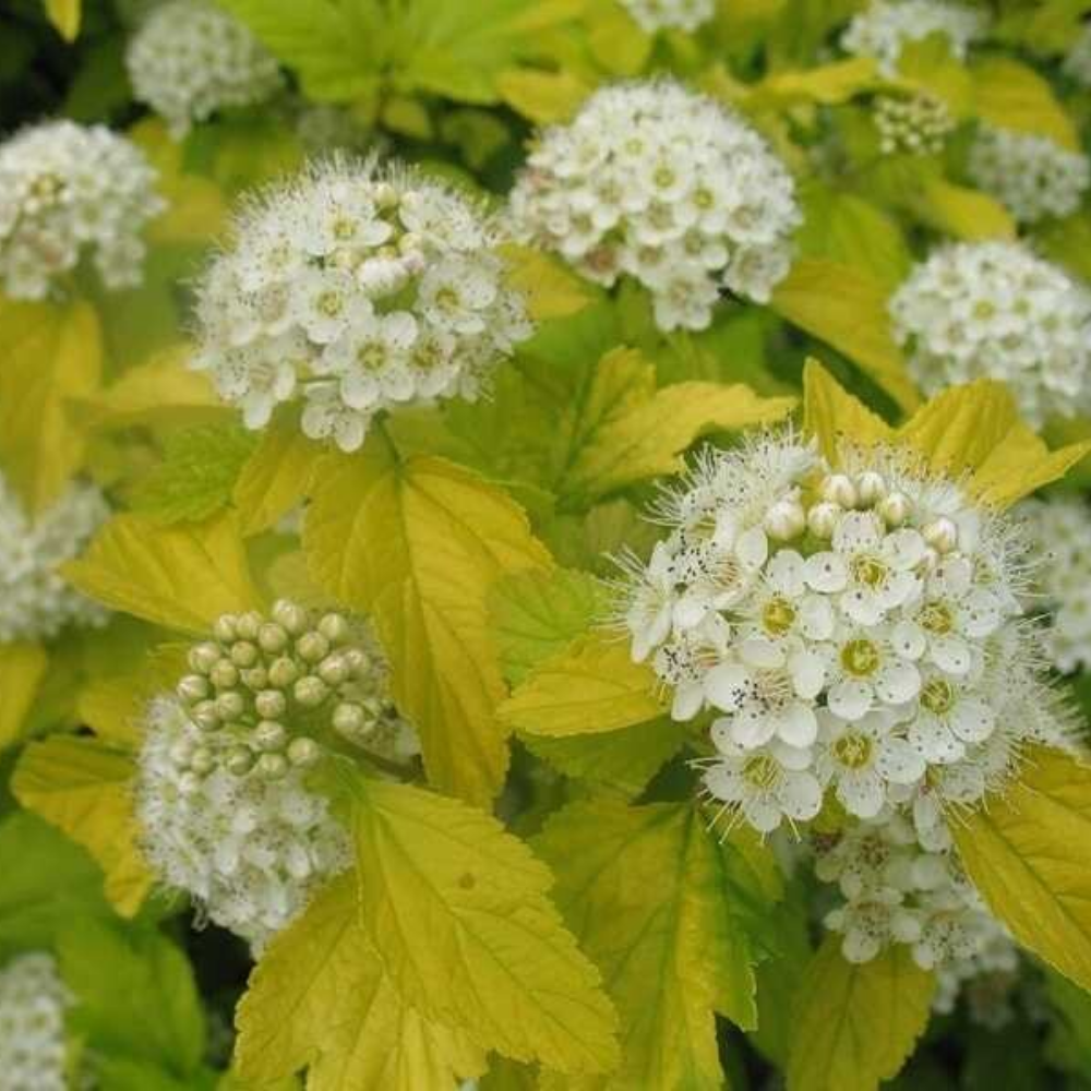 Цветет такой пузыреплодник в июне-июле. Соцветия полушаровидные, до 7 сантиметров размером. Формируются из мелких цветочков (1 см), окрашенных в бело-розовые тона. Цветы плоские, округлые, с алыми тычинками. Позднее на их месте созревают плоды (август-сентябрь).