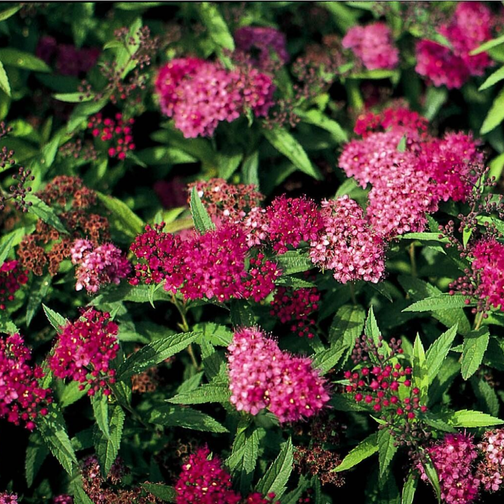 Спирея Неон Флеш являет собой декоративный, красивоцветущий, листопадный кустарник. Соцветия зонтиковидные, диаметром 4-8 сантиметров, розовой окраски. Кусты культуры компактные, высотой 0,8-1 метр. Диаметр кроны равняется 90 сантиметрам. Ветки немного изогнуты и раскинуты, молодые – светло-зеленой окраски, а с годами становятся пурпурово-коричневыми. Вследствие фактически одинаковых характеристик ширины и высоты, раскидистости ветвей куст обладает слегка шаровидной формой.