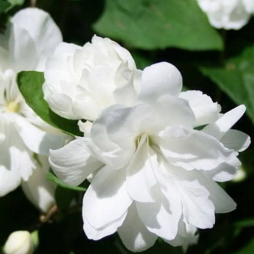 Куст высотой 2-3 м с широкой кроной и бурыми побегами, с растрескивающейся и отслаивающейся корой. Листья овальные, заостренные, длиной до 7 см, темно-зеленые, осенью, как и у всех чубушников, желтые. Цветет в июле, иногда может быть более слабое осеннее цветение, белыми, махровыми цветками, диаметром до 5 см, собранными в соцветия длиной до 14 см. Куст сохраняет декоративность до 20 лет.