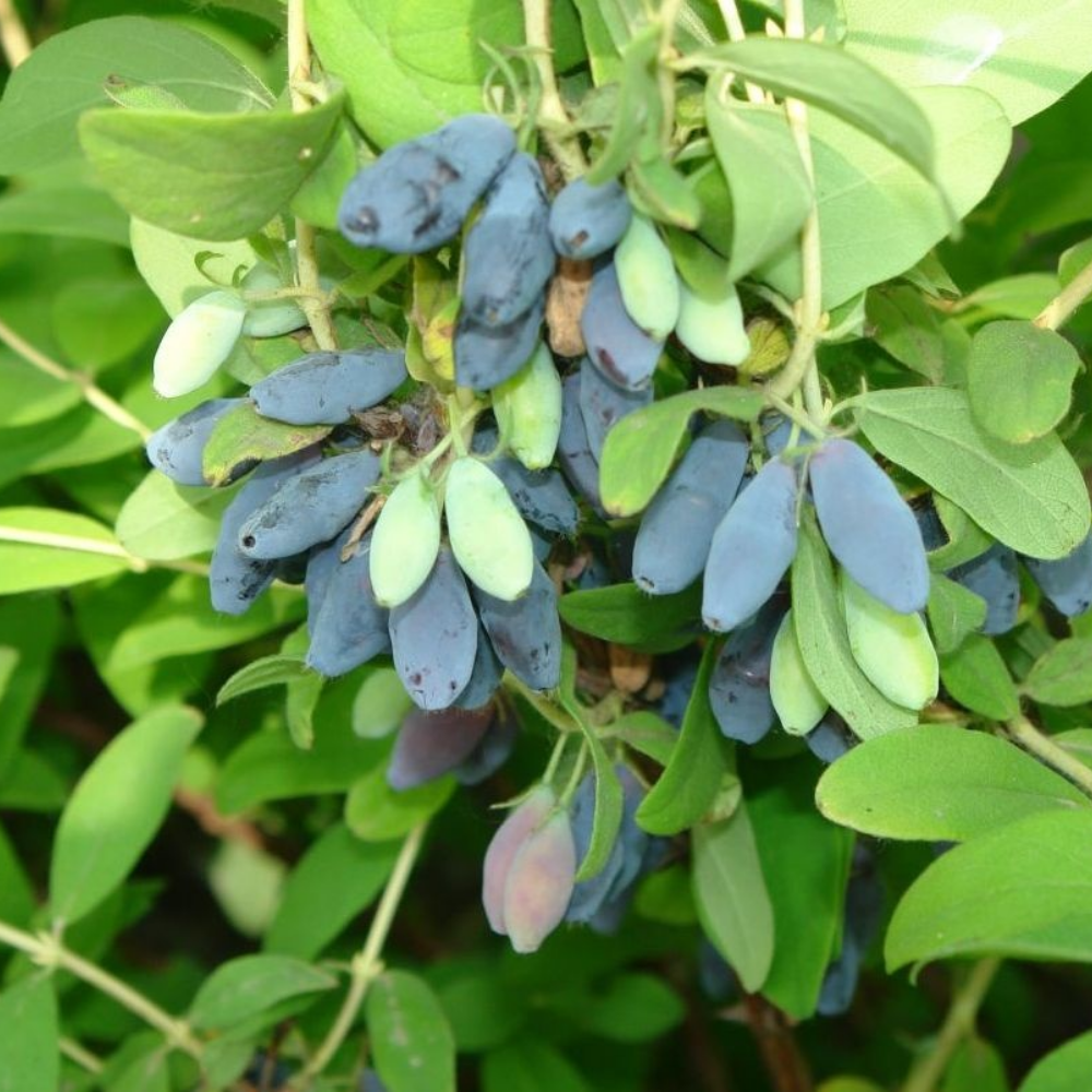 Ягоды жимолости Камчадалка имеют массу от 0,8 до 1,3 грамма. Длина плода составляет 2,5 сантиметра, диаметр – 1 сантиметр. Они покрыты сине-голубой плотной кожицей с легким восковым налетом.