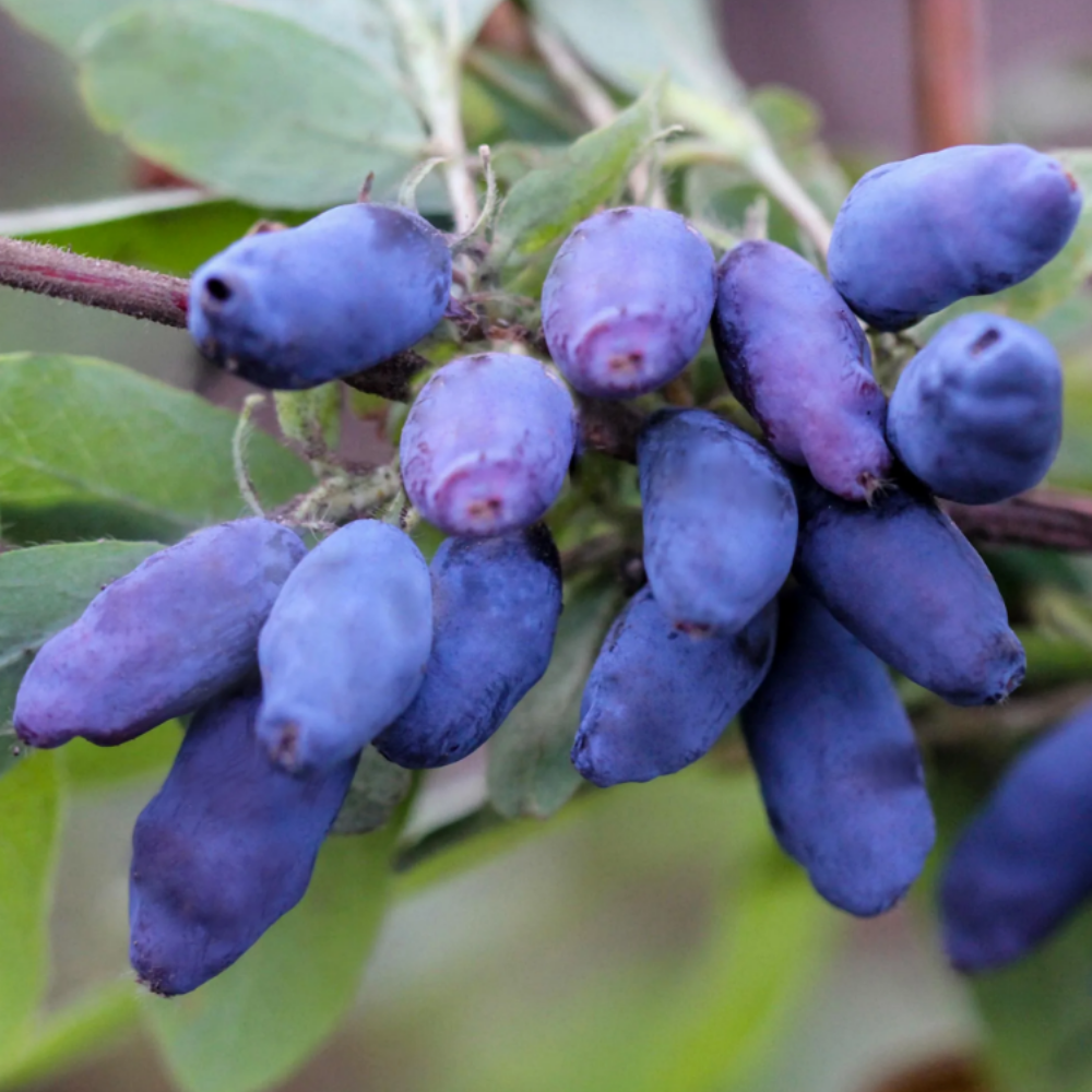 Жимолость Нарымская – это крупноплодная разновидность. Ягодки на кустах вырастают массой 0,9-1,5 г. Форма плодов удлиненно-овальная, иногда стручковидная. Спелая жимолость покрывается темно-фиолетовым окрасом, разбавленным густым сизым налетом, напоминающим восковый. Кожица у ягод плотная, но не жесткая, с заметной бугристостью. Крепятся на укороченных плодоножках ягоды крепко, при этом отрыв у плодов сухой. Спелые ягоды не осыпаются.